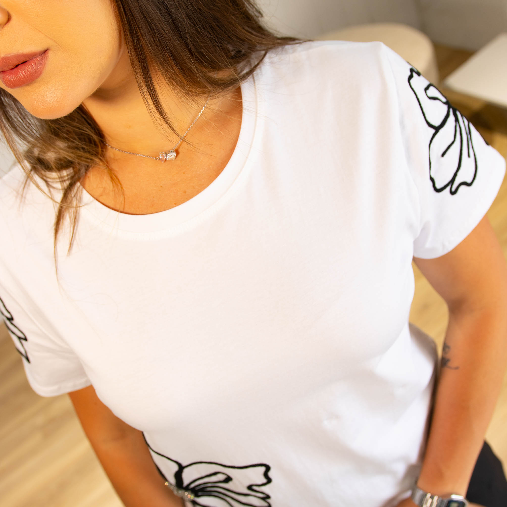 Um toque de delicadeza para o dia a dia. Essa T-shirt combina o básico com o romântico através de um bordado floral sutil e encantador. Confeccionada em malha macia e confortável, ela tem caimento leve e versátil, perfeita para compor looks casuais com um ar feminino e cheio de charme. Ideal para quem ama detalhes que fazem a diferença.