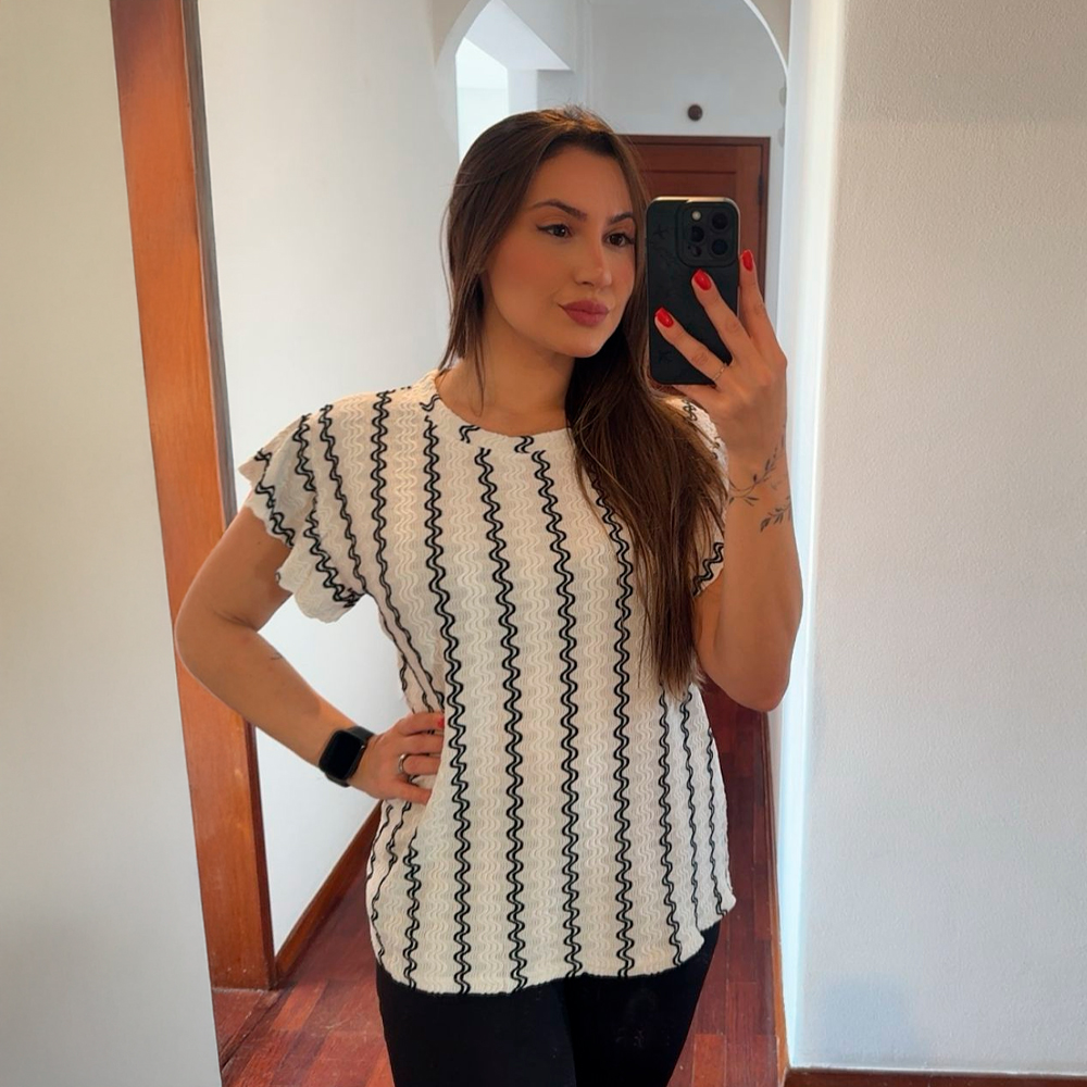 A Blusa com Riscas em Zigue-Zague da Liss Love é a escolha perfeita para quem busca um visual único e cheio de personalidade. Com um design ousado de riscas em zigue-zague, ela traz movimento e energia para o seu look, criando uma silhueta vibrante e moderna. Seu tecido confortável e leve proporciona o toque ideal para qualquer estação, enquanto o padrão gráfico acrescenta um toque de sofisticação descontraída. Perfeita para compor tanto com jeans e saias, quanto com calças de alfaiataria, essa blusa é uma verdadeira peça-chave para quem ama ousar sem perder o estilo.