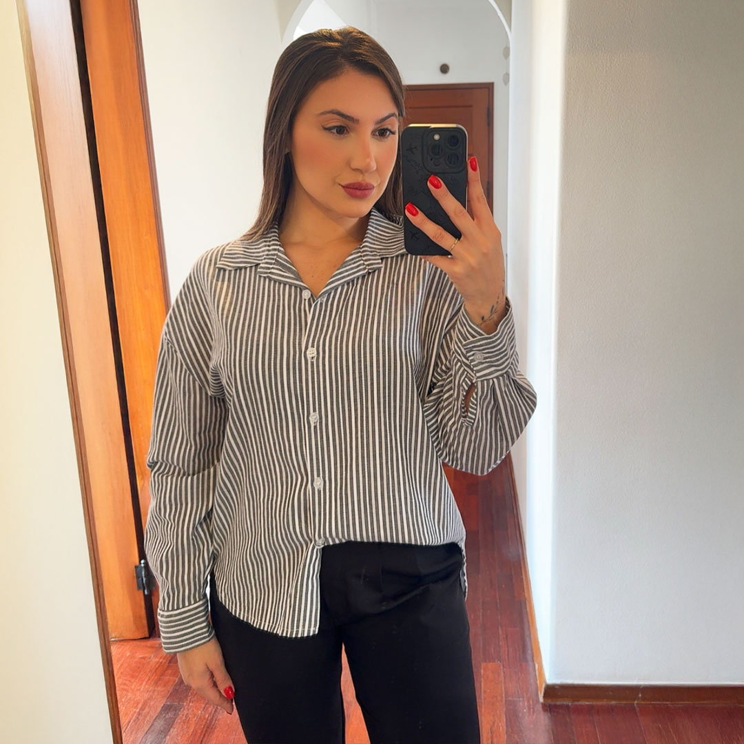 Um clássico que nunca sai de cena. A camisa de riscas é sinônimo de elegância atemporal, com listras que alongam a silhueta e trazem um toque de sofisticação ao visual. Com corte impecável e tecido leve, ela é perfeita para transitar entre o office look e produções mais casuais com muito estilo. Uma peça essencial para quem valoriza moda com personalidade e versatilidade.