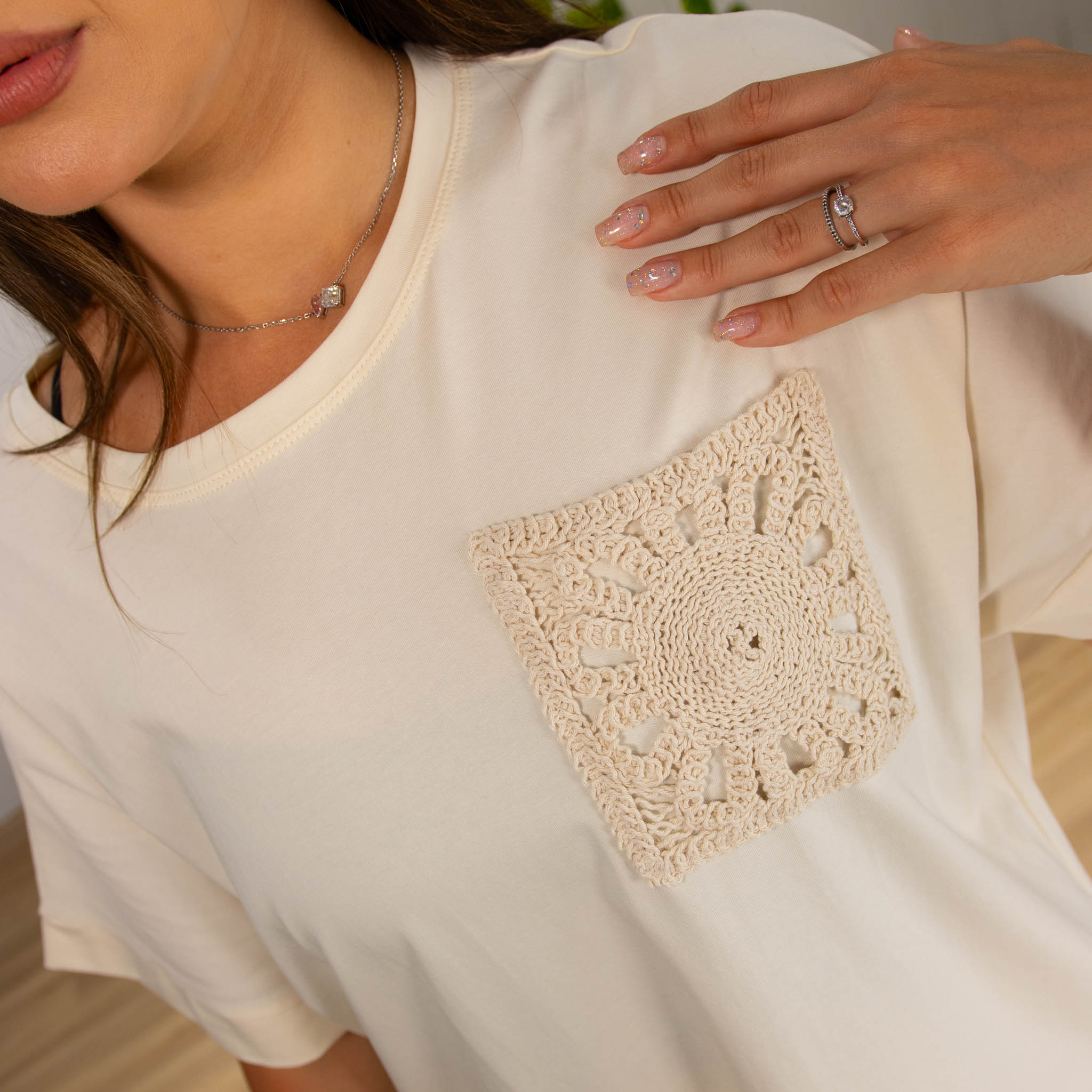 Um detalhe que transforma o básico. Essa T-shirt une conforto e charme com bolsos bordados que trazem um toque artesanal e cheio de personalidade. Confeccionada em malha macia, ela tem modelagem leve e versátil, ideal para compor looks casuais com um toque diferenciado. Perfeita para quem valoriza peças simples, mas com acabamento especial.