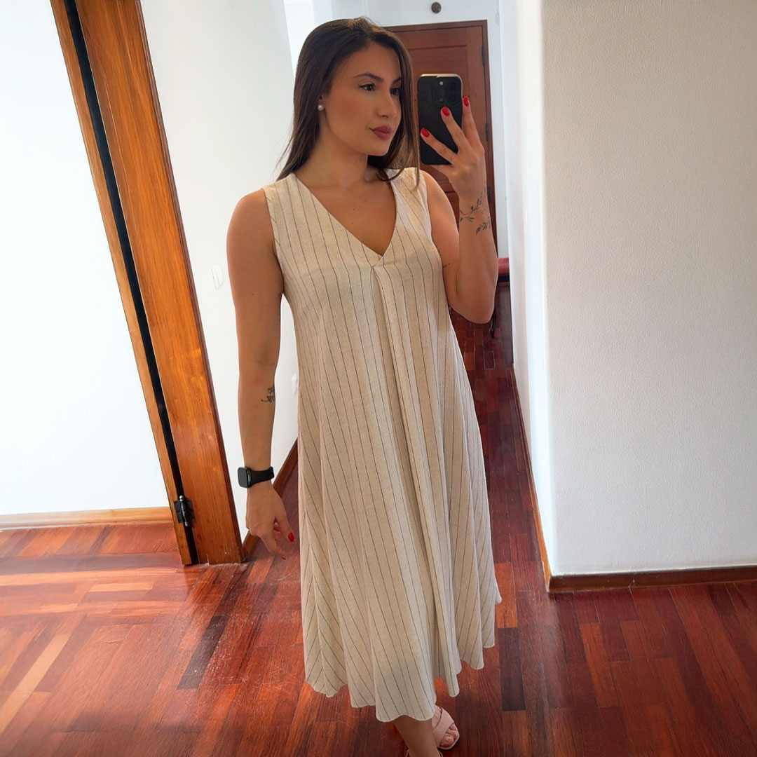 O vestido Amélia combina a elegância das riscas com uma modelagem que valoriza a silhueta de forma sutil e sofisticada. Perfeito para quem ama um visual refinado sem abrir mão do conforto, ele transita com leveza entre o casual chic e o estilo mais alinhado. Um verdadeiro curinga para os dias em que você quer se sentir naturalmente elegante.