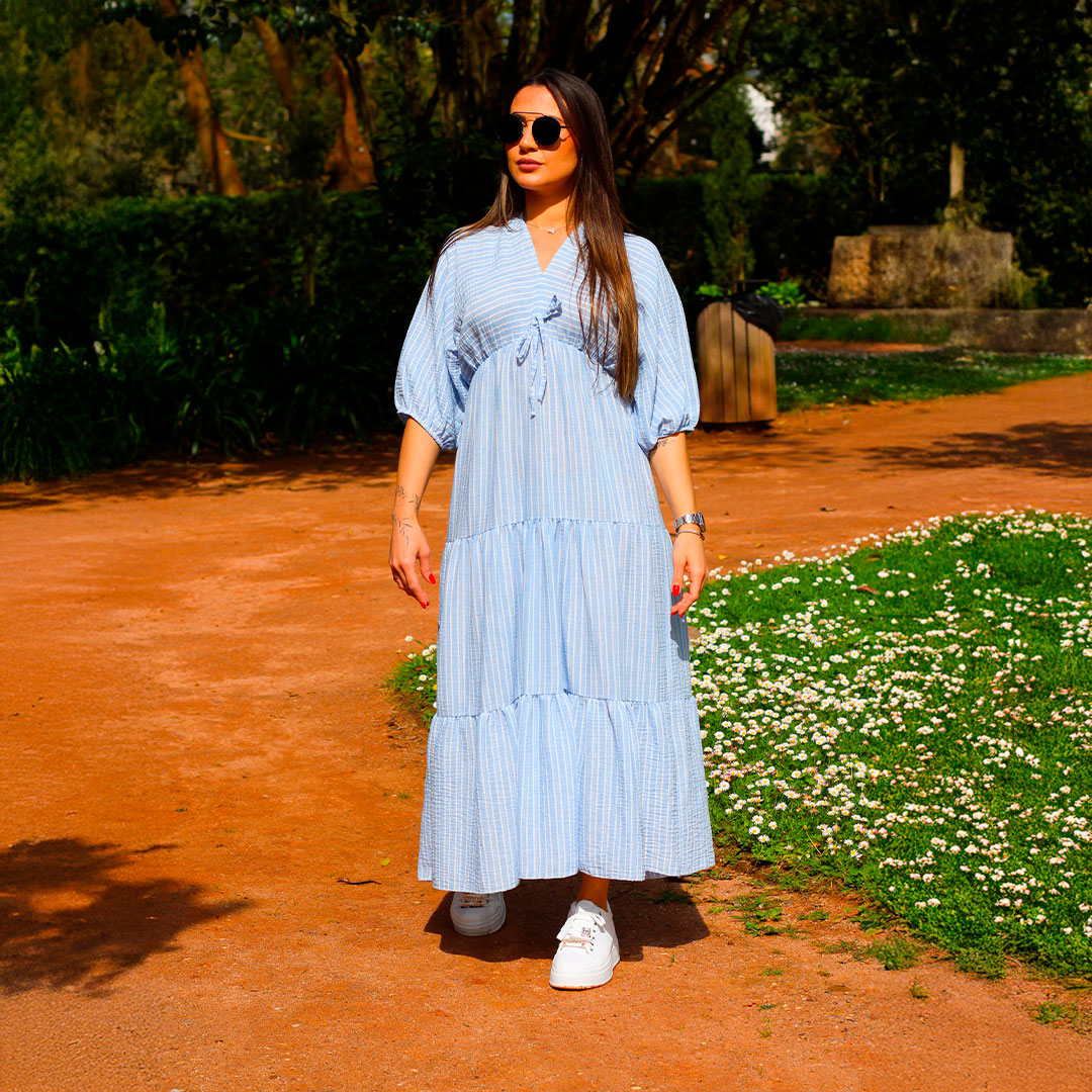 Brisa é aquele vestido que traduz a leveza dos dias ensolarados. Feito em linho com riscas delicadas, ele une frescor e sofisticação em cada detalhe. Com uma modelagem que valoriza o movimento e o conforto, é a escolha perfeita para quem busca um visual natural, elegante e atemporal. Use com sandálias, rasteiras ou tênis para um look effortlessly chic.